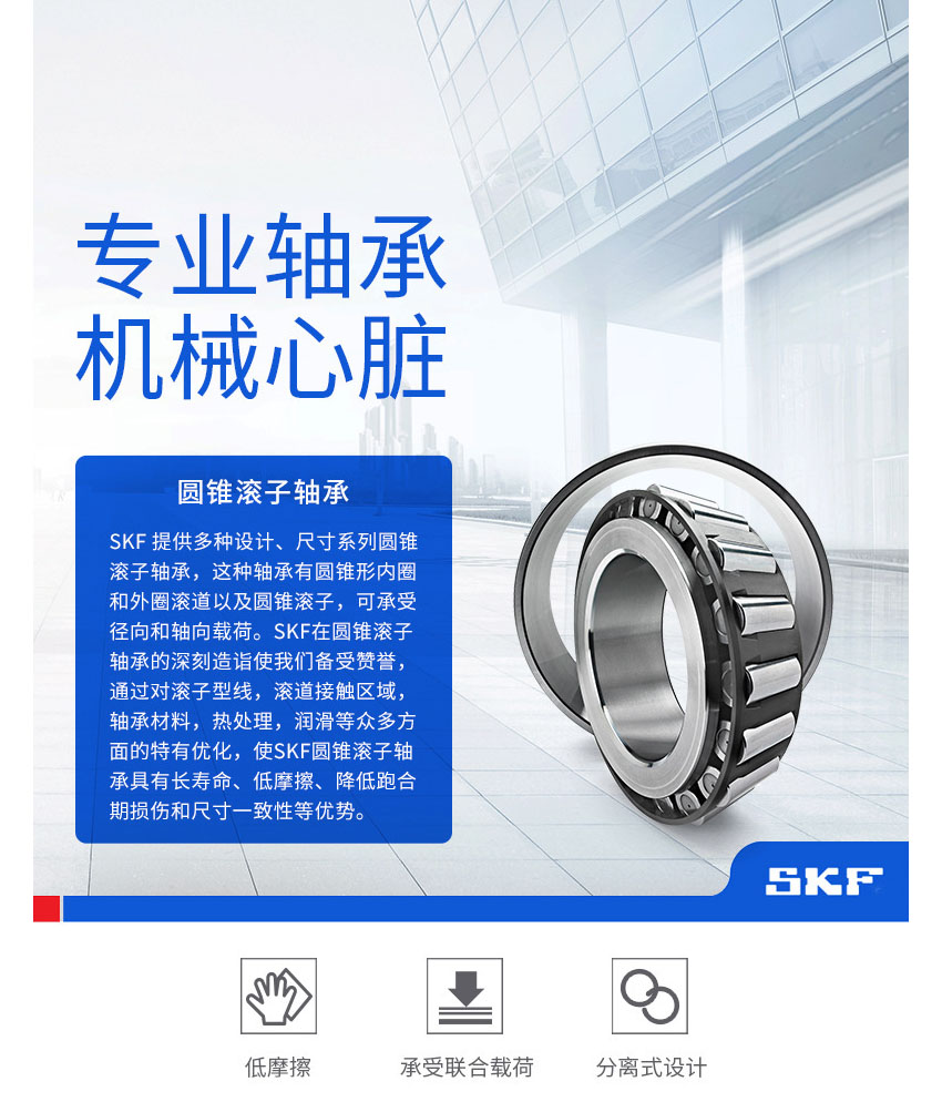 SKF圓錐滾子軸承,可以分離,由內圈與滾子、保持架一起組成的組件和外圈可以分別安裝。
